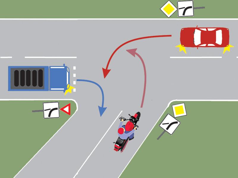 The truck comes from the road without priority, encountering the sign “Give way”, and must give way to the car and the motorcycle that come from the priority road.