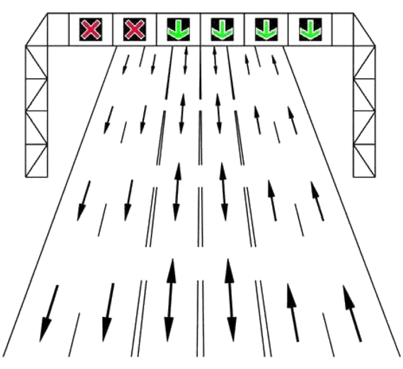 Benzile din mijloc se pot folosi în ambele sensuri, în funcție de culoarea semafoarelor de deasupra benzilor.