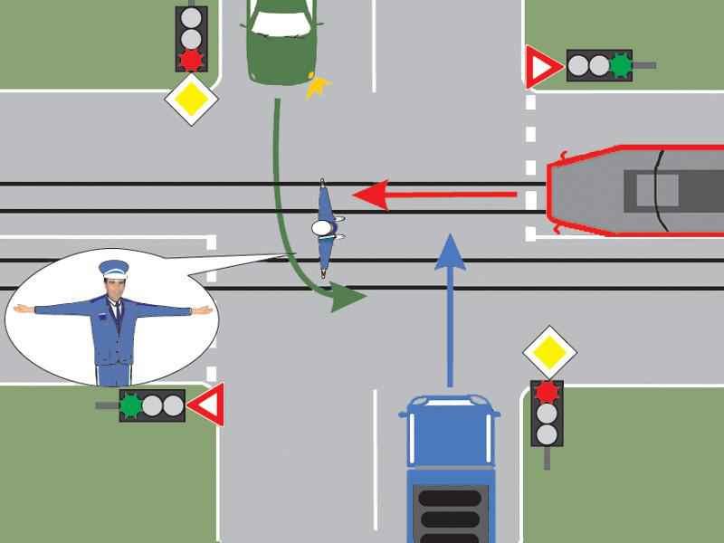Polițistul rutier execută un semnal cu brațele întinse orizontal, acest semnal semnifică oprire pentru toți participanții la trafic a căror direcție inițială de deplasare se intersectează cu brațele acestuia, mai exact pentru cei care circulă din fața și din spatele polițistului. În această situație direcția inițială de deplasare a tramvaiului se intersectează cu brațul stâng al polițistului și trebuie să oprească. Autoturismul verde și camionul își pot continua deplasarea. Deci în această situație polițistul rutier nu permite trecerea tramvaiului.